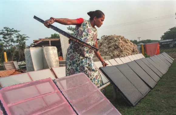 Rina Deuri (pictured in 2002) has been a papermaking artisan at Biborton Handmade Paper in Agailjhara, Bangladesh, since 1993, earning income that has changed life for her and her family. (MCC photo/Matthew Lester)